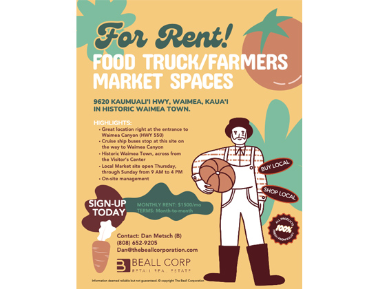 Food Truck/Farmers Market Fair spaces for lease in historic Waimea Town. Located on Kaumualii Hwy, directly across from the entrance to Waimea Canyon Dr (HWY 550) and the West Kauai Visitor’s Center.